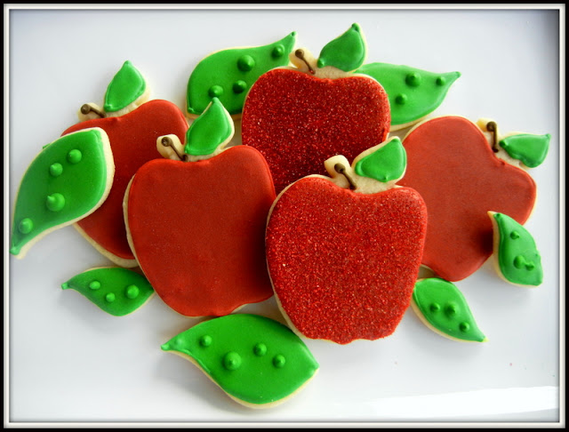 We recently took our little boys apple picking and it inspired me to make some apple cookies! I have a few different sizes and shapes of apple cutters so I tried them out. My 4 year old says that the sparkly ones are the best! When we start Kindergarten I think that these will make a great teacher gift!
